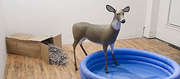 Perhaps the most emblematic piece, which seems to be the focal centre of show design-wise and thematically, is this centrally located decoy deer, refreshing itself at the edge of small pool of water. The inflatable pool, with its pneumatically trapped air, connotes a sense of suspension and artificiality, much like the deer, frozen in its own temporality and plasticity. Imaginably, this staged scene is the source of the exhibition’s namesake: the decoy poser at the nexus of it all.