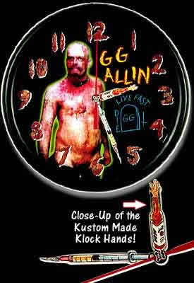 This Klock is sooo foul for when you gaze upon it you can actually smell the shit that PuNk RoCk star GG ALLIN was takin' when this foul photo was snapped! GG was the ultimate punk/performance artist whose reign of terror lasted 37 years before his death of a heroin overdose in 1993. Shows were video taped and are available for sale-they even pop up on eBay every now and then. There was an awesome Documentary made on him called "Hated" which is a must see!